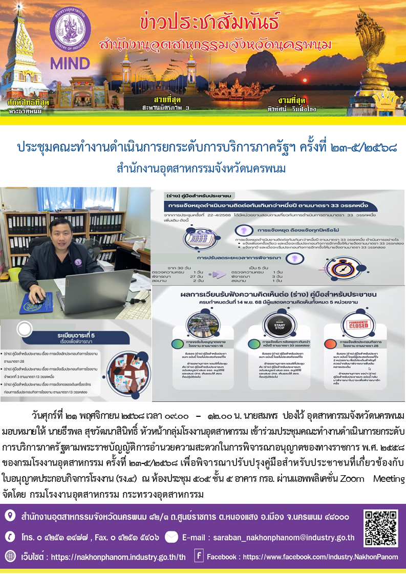 วันศุกร์ที่ 21 พฤศจิกายน 2568 เวลา 09.00 – 12.00 น. นายสมพร ปองไว้ อุตสาหกรรมจังหวัดนครพนม มอบหมายให้ นายธีรพล สุขวัฒนาสินิทธิ์ หัวหน้ากลุ่มโรงงานอุตสาหกรรม เข้าร่วมประชุมคณะทำงานดำเนินการยกระดับการบริการภาครัฐตามพระราชบัญญัติการอำนวยความสะดวกในการพิจารณาอนุญาตของทางราชการ พ.ศ. 2558 ของกรมโรงงานอุตสาหกรรม ครั้งที่ 23-5/2568 เพื่อพิจารณาปรับปรุงคู่มือสำหรับประชาชนที่เกี่ยวข้องกับใบอนุญาตประกอบกิจการโรงงาน (รง.4) ณ ห้องประชุม 505 ชั้น 5 อาคาร กรอ. ผ่านแอพพลิเคชั่น Zoom Meeting จัดโดยกรมโรงงานอุตสาหกรรม กระทรวงอุตสาหกรรม