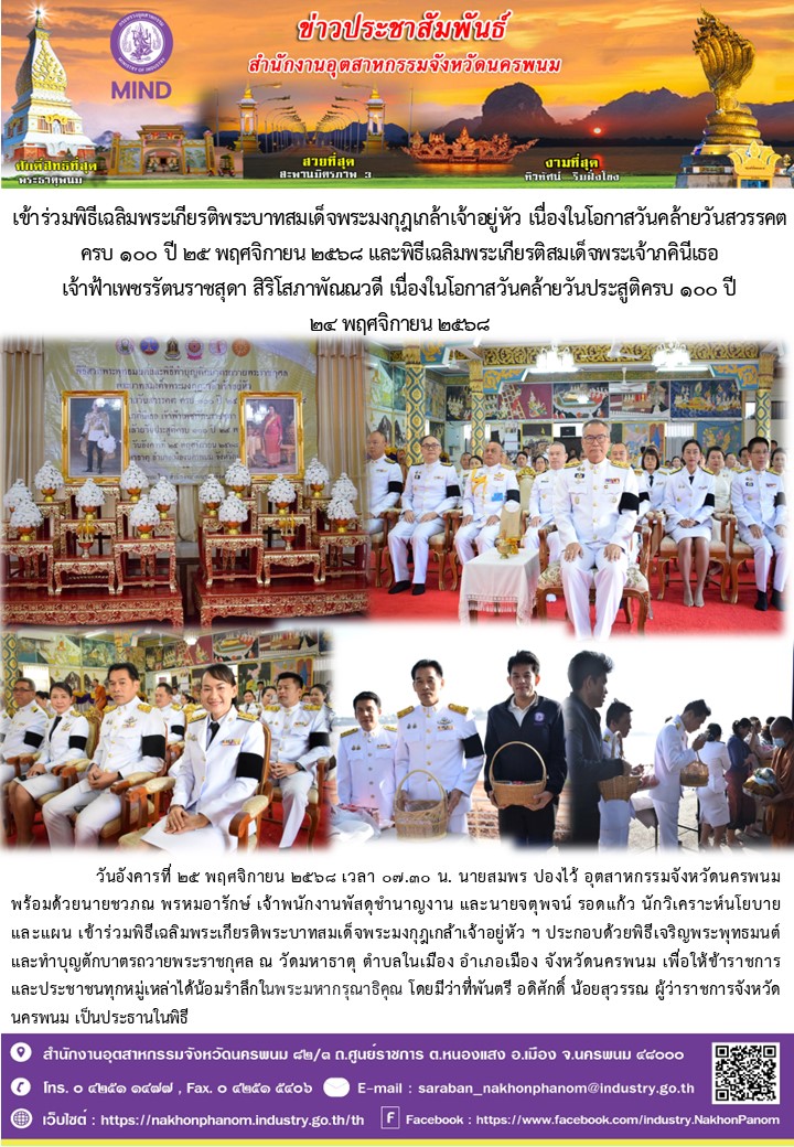 วันอังคารที่ 25 พฤศจิกายน 2568 เวลา 07.30 น. นายสมพร ปองไว้ อุตสาหกรรมจังหวัดนครพนม พร้อมด้วยนายชวภณ พรหมอารักษ์ เจ้าพนักงานพัสดุชำนาญงาน และนายจตุพจน์ รอดแก้ว นักวิเคราะห์นโยบายและแผน เข้าร่วมพิธีเฉลิมพระเกียรติพระบาทสมเด็จพระมงกุฎเกล้าเจ้าอยู่หัว เนื่องในโอกาสวันคล้ายวันสวรรคตครบ ๑๐๐ ปี ๒๕ พฤศจิกายน ๒๕๖๘ และพิธีเฉลิมพระเกียรติสมเด็จพระเจ้าภคินีเธอ เจ้าฟ้าเพชรรัตนราชสุดา สิริโสภาพัณณวดี เนื่องในโอกาสวันคล้ายวันประสูติครบ ๑๐๐ ปี ๒๔ พฤศจิกายน ๒๕๖๘ ประกอบด้วยพิธีเจริญพระพุทธมนต์ และทำบุญตักบาตรถวายพระราชกุศล ณ วัดมหาธาตุ ตำบลในเมือง อำเภอเมือง จังหวัดนครพนม เพื่อให้ข้าราชการ และประชาชนทุกหมู่เหล่าได้น้อมรำลึกในพระมหากรุณาธิคุณ โดยมีว่าที่พันตรี อดิศักดิ์ น้อยสุวรรณ ผู้ว่าราชการจังหวัดนครพนม เป็นประธานในพิธี
