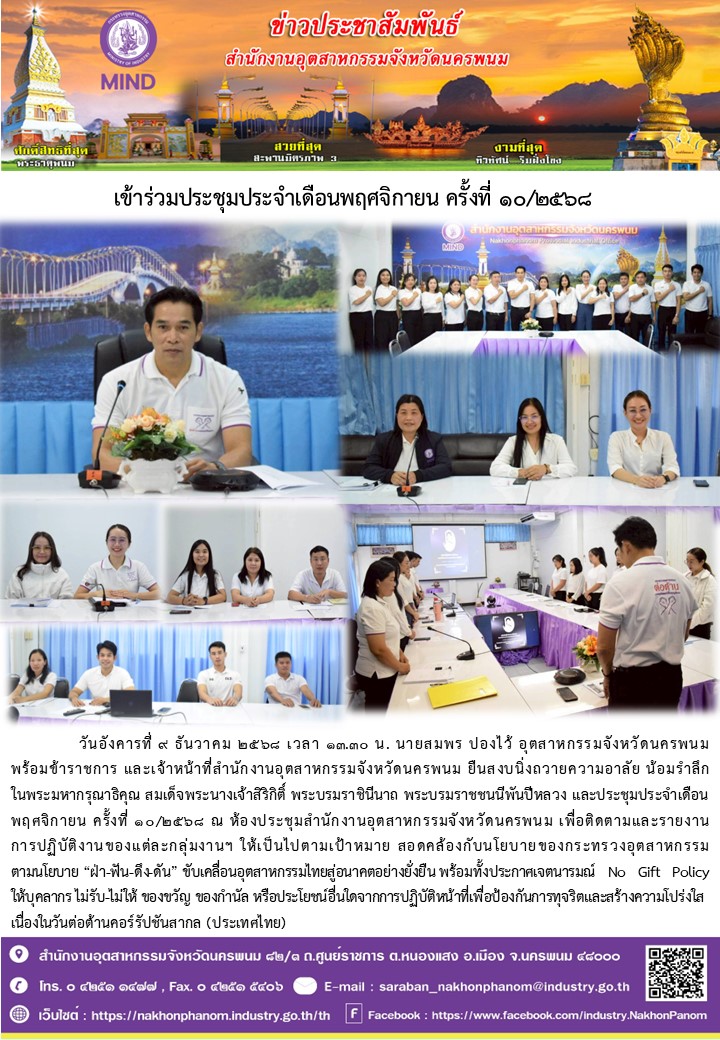 วันอังคารที่ 9 ธันวาคม 2568 เวลา 13.30 น. นายสมพร ปองไว้ อุตสาหกรรมจังหวัดนครพนม พร้อมข้าราชการ และเจ้าหน้าที่สำนักงานอุตสาหกรรมจังหวัดนครพนม ยืนสงบนิ่งถวายความอาลัย น้อมรำลึก ในพระมหากรุณาธิคุณ สมเด็จพระนางเจ้าสิริกิติ์ พระบรมราชินีนาถ พระบรมราชชนนีพันปีหลวง และประชุมประจำเดือนพฤศจิกายน ครั้งที่ 10/2568 ณ ห้องประชุมสำนักงานอุตสาหกรรมจังหวัดนครพนม เพื่อติดตามและรายงาน การปฏิบัติงานของแต่ละกลุ่มงานฯ ให้เป็นไปตามเป้าหมาย สอดคล้องกับนโยบายของกระทรวงอุตสาหกรรม ตามนโยบาย “ฝ่า-ฟัน-ดึง-ดัน” ขับเคลื่อนอุตสาหกรรมไทยสู่อนาคตอย่างยั่งยืน พร้อมทั้งประกาศเจตนารมณ์ No Gift Policy ให้บุคลากร ไม่รับ-ไม่ให้ ของขวัญ ของกำนัล หรือประโยชน์อื่นใดจากการปฏิบัติหน้าที่เพื่อป้องกันการทุจริตและสร้างความโปร่งใส เนื่องในวันต่อต้านคอร์รัปชันสากล (ประเทศไทย)