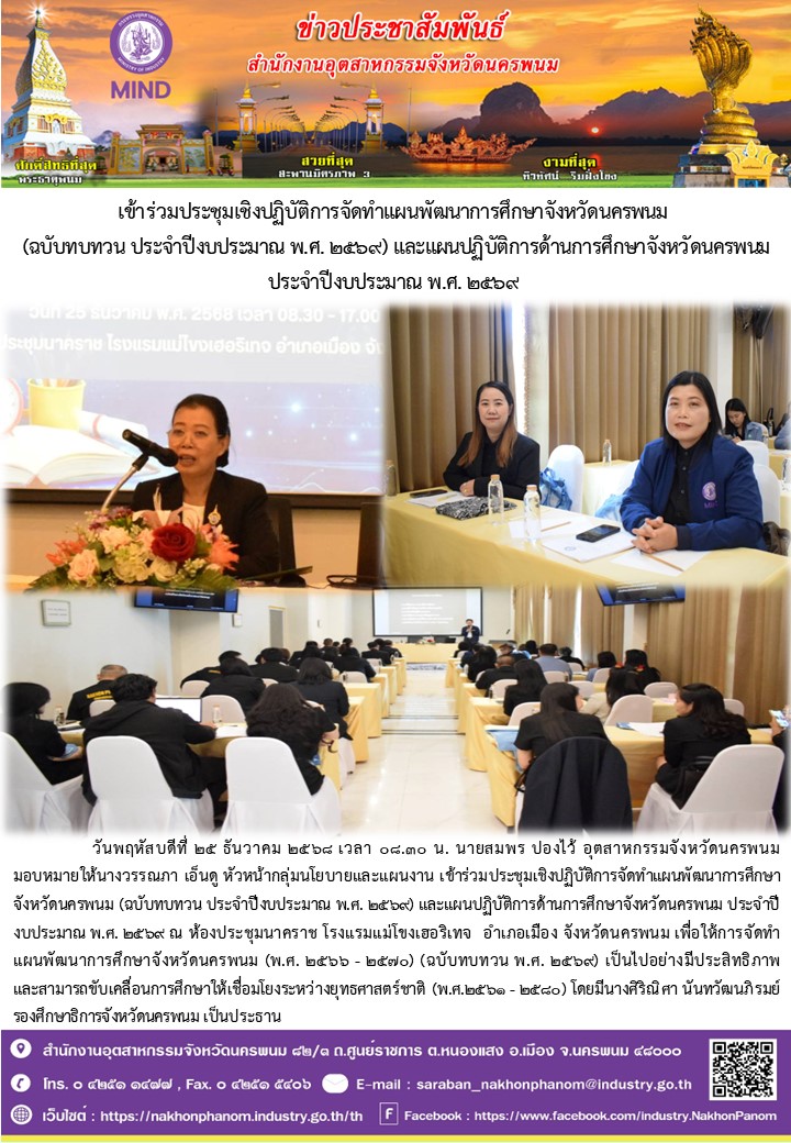 วันพฤหัสบดีที่ 25 ธันวาคม 2568 เวลา 08.30 น. นายสมพร ปองไว้ อุตสาหกรรมจังหวัดนครพนม มอบหมายให้นางวรรณภา เอ็นดู หัวหน้ากลุ่มนโยบายและแผนงาน เข้าร่วมประชุมเชิงปฏิบัติการจัดทำแผนพัฒนาการศึกษาจังหวัดนครพนม (ฉบับทบทวน ประจำปีงบประมาณ พ.ศ. 2569) และแผนปฏิบัติการด้านการศึกษาจังหวัดนครพนม ประจำปีงบประมาณ พ.ศ. 2569 ณ ห้องประชุมนาคราช โรงแรมแม่โขงเฮอริเทจ อำเภอเมือง จังหวัดนครพนม เพื่อให้การจัดทำแผนพัฒนาการศึกษาจังหวัดนครพนม (พ.ศ. 2566 - 2570) (ฉบับทบทวน พ.ศ. 2569) เป็นไปอย่างมีประสิทธิภาพและสามารถขับเคลื่อนการศึกษาให้เชื่อมโยงระหว่างยุทธศาสตร์ชาติ (พ.ศ.2561 - 2580) โดยมีนางศิริณิศา นันทวัฒนภิรมย์ รองศึกษาธิการจังหวัดนครพนม เป็นประธาน