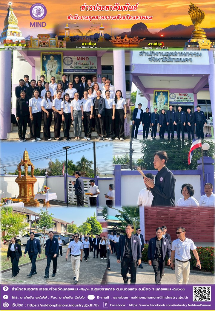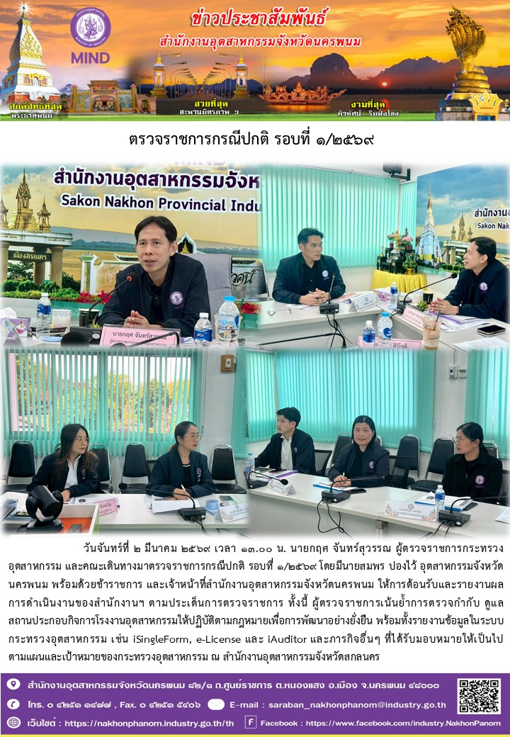 วันจันทร์ที่ 2 มีนาคม 2569 เวลา 13.00 น. นายกฤศ จันทร์สุวรรณ ผู้ตรวจราชการกระทรวงอุตสาหกรรม และคณะเดินทางมาตรวจราชการกรณีปกติ รอบที่ 1/2569 โดยมีนายสมพร ปองไว้ อุตสาหกรรมจังหวัดนครพนม พร้อมด้วยข้าราชการ และเจ้าหน้าที่สำนักงานอุตสาหกรรมจังหวัดนครพนม ให้การต้อนรับและรายงานผล การดำเนินงานของสำนักงานฯ ตามประเด็นการตรวจราชการ ทั้งนี้ ผู้ตรวจราชการเน้นย้ำการตรวจกำกับ ดูแลสถานประกอบกิจการโรงงานอุตสาหกรรมให้ปฏิบัติตามกฎหมายเพื่อการพัฒนาอย่างยั่งยืน พร้อมทั้งรายงานข้อมูลในระบบกระทรวงอุตสาหกรรม เช่น iSingleForm, e-License และ iAuditor และภารกิจอื่นๆ ที่ได้รับมอบหมายให้เป็นไปตามแผนและเป้าหมายของกระทรวงอุตสาหกรรม ณ สำนักงานอุตสาหกรรมจังหวัดสกลนคร