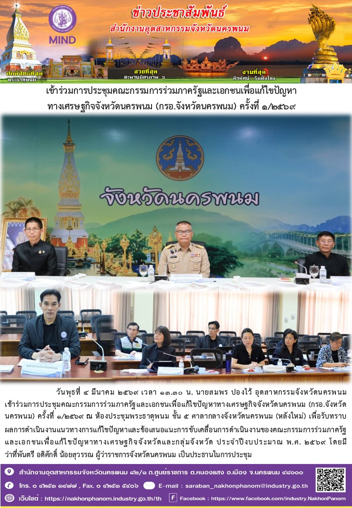 เข้าร่วมการประชุมคณะกรรมการร่วมภาครัฐและเอกชนเพื่อแก้ไขปัญหาทางเศรษฐกิจจังหวัดนครพนม (กรอ.จังหวัดนครพนม) ครั้งที่ 1/2569