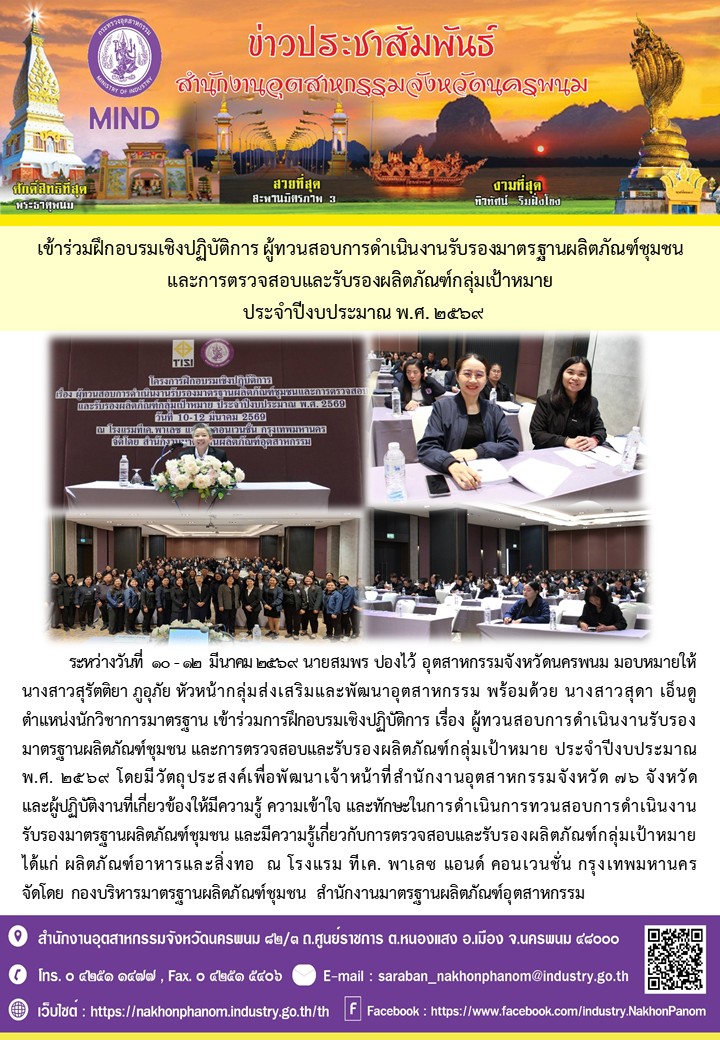 ระหว่างวันที่ 10 - 12 มีนาคม 2569 นายสมพร ปองไว้ อุตสาหกรรมจังหวัดนครพนม มอบหมายให้นางสาวสุรัตติยา ภูอุภัย หัวหน้ากลุ่มส่งเสริมและพัฒนาอุตสาหกรรม พร้อมด้วย นางสาวสุดา เอ็นดู ตำแหน่งนักวิชาการมาตรฐาน เข้าร่วมการฝึกอบรมเชิงปฏิบัติการ เรื่อง ผู้ทวนสอบการดำเนินงานรับรองมาตรฐานผลิตภัณฑ์ชุมชน และการตรวจสอบและรับรองผลิตภัณฑ์กลุ่มเป้าหมาย ประจำปีงบประมาณ พ.ศ. 2569 โดยมีวัตถุประสงค์เพื่อพัฒนาเจ้าหน้าที่สำนักงานอุตสาหกรรมจังหวัด 76 จังหวัด และผู้ปฏิบัติงานที่เกี่ยวข้องให้มีความรู้ ความเข้าใจ และทักษะในการดำเนินการทวนสอบการดำเนินงานรับรองมาตรฐานผลิตภัณฑ์ชุมชน