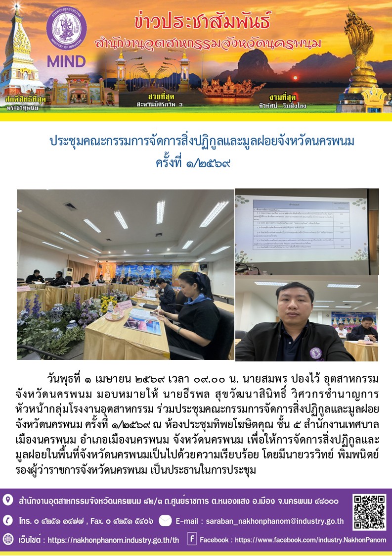 วันพุธที่ 1 เมษายน 2569 เวลา 09.00 น. นายสมพร ปองไว้ อุตสาหกรรมจังหวัดนครพนม มอบหมายให้ นายธีรพล สุขวัฒนาสินิทธิ์ วิศวกรชำนาญการ หัวหน้ากลุ่มโรงงานอุตสาหกรรม ร่วมประชุมคณะกรรมการจัดการสิ่งปฏิกูลและมูลฝอยจังหวัดนครพนม ครั้งที่ 1/2569 ณ ห้องประชุมทิพยโฆษิตคุณ ชั้น 5 สำนักงานเทศบาลเมืองนครพนม อำเภอเมืองนครพนม จังหวัดนครพนม เพื่อให้การจัดการสิ่งปฏิกูลและ มูลฝอยในพื้นที่จังหวัดนครพนมเป็นไปด้วยความเรียบร้อย โดยมีนายวรวิทย์ พิมพนิตย์ รองผู้ว่าราชการจังหวัดนครพนม เป็นประธานในการประชุม