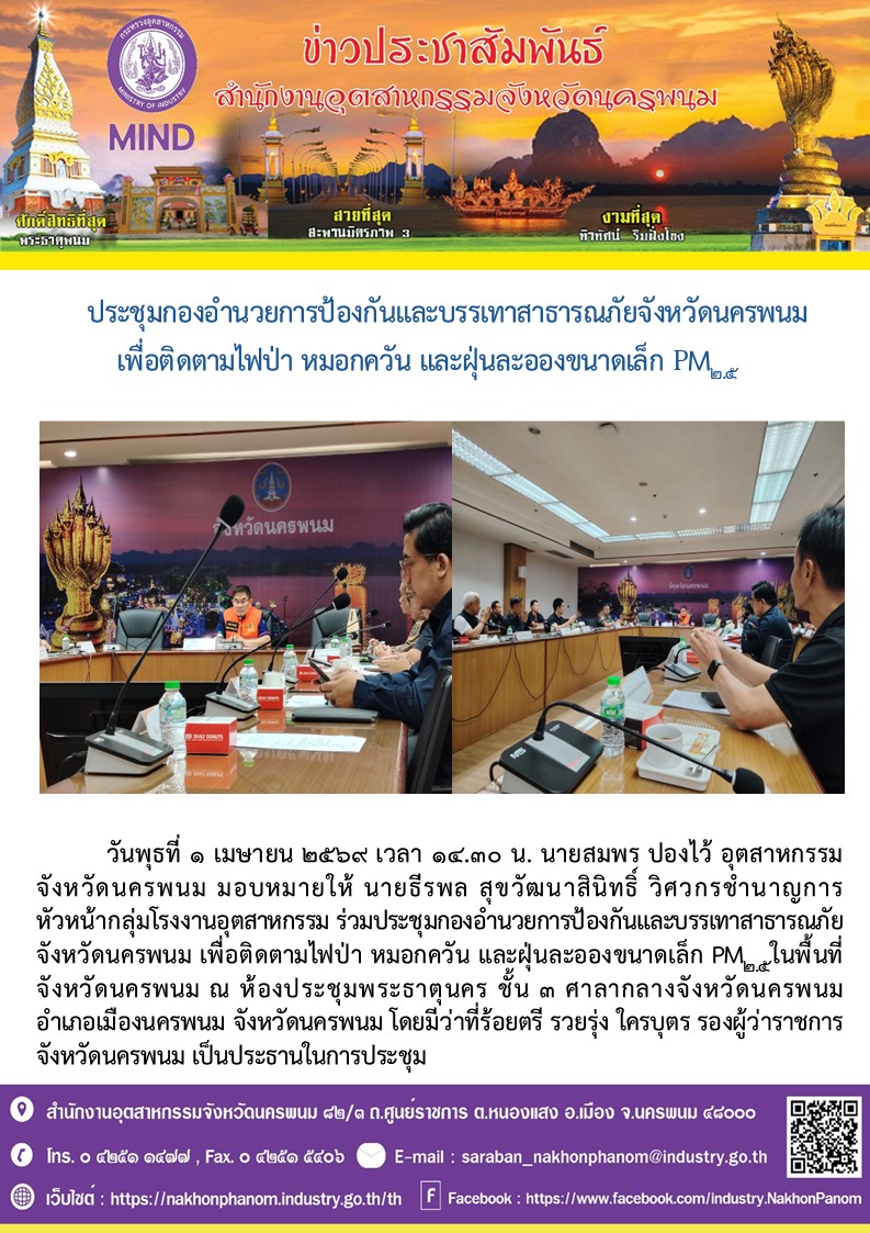 วันพุธที่ 1 เมษายน 2569 เวลา 14.30 น. นายสมพร ปองไว้ อุตสาหกรรมจังหวัดนครพนม มอบหมายให้ นายธีรพล สุขวัฒนาสินิทธิ์ วิศวกรชำนาญการ หัวหน้ากลุ่มโรงงานอุตสาหกรรม ร่วมประชุมกองอำนวยการป้องกันและบรรเทาสาธารณภัยจังหวัดนครพนม เพื่อติดตามไฟป่า หมอกควัน และฝุ่นละอองขนาดเล็ก PM2.5ในพื้นที่จังหวัดนครพนม ณ ห้องประชุมพระธาตุนคร ชั้น 3 ศาลากลางจังหวัดนครพนม อำเภอเมืองนครพนม จังหวัดนครพนม โดยมีว่าที่ร้อยตรี รวยรุ่ง ใครบุตร รองผู้ว่าราชการจังหวัดนครพนม เป็นประธานในการประชุม