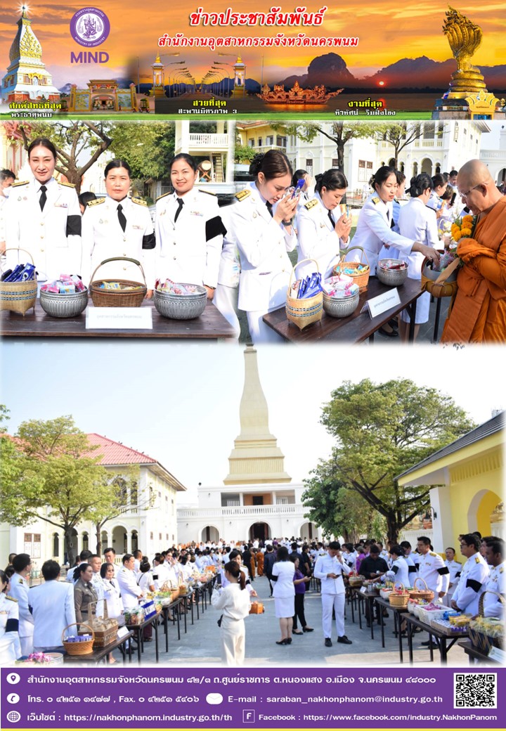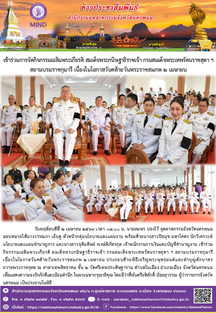 วันพฤหัสบดีที่ 2 เมษายน 2569 เวลา 07.00 น. นายสมพร ปองไว้ อุตสาหกรรมจังหวัดนครพนม มอบหมายให้นางวรรณภา เอ็นดู หัวหน้ากลุ่มนโยบายและแผนงาน พร้อมด้วยนางสาวปิยนุช มหาโคตร นักวิเคราะห์นโยบายและแผนชำนาญการ และนางสาวจุลินทิพย์ พงษ์พิภัทรกุล เจ้าพนักงานการเงินและบัญชีชำนาญงาน เข้าร่วมกิจกรรมเฉลิมพระเกียรติ สมเด็จพระกนิษฐาธิราชเจ้า กรมสมเด็จพระเทพรัตนราชสุดา ฯ สยามบรมราชกุมารี เนื่องในโอกาสวันคล้ายวันพระราชสมภพ 2 เมษายน ประกอบด้วยพิธีเจริญพระพุทธมนต์และทำบุญตักบาตร ถวายพระราชกุศล ณ ศาลาเทพสิทธาคม ชั้น 2 วัดศรีเทพประดิษฐาราม ตำบลในเมือง อำเภอเมือง จังหวัดนครพนม เพื่อแสดงความจงรักภักดีและน้อมสำนึก ในพระมหากรุณาธิคุณ โดยมีว่าที่พันตรีอดิศักดิ์ น้อยสุวรรณ ผู้ว่าราชการจังหวัดนครพนม เป็นประธานในพิธี