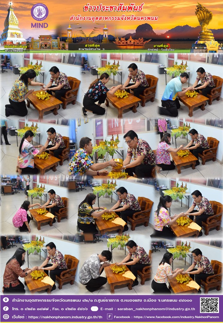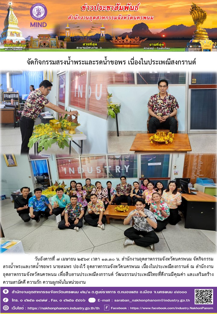 วันอังคารที่ 7 เมษายน 2569 เวลา 13.30 น. สำนักงานอุตสาหกรรมจังหวัดนครพนม จัดกิจกรรมสรงน้ำพระและรดน้ำขอพร นายสมพร ปองไว้ อุตสาหกรรมจังหวัดนครพนม เนื่องในประเพณีสงกรานต์ ณ สำนักงานอุตสาหกรรมจังหวัดนครพนม เพื่อสืบสานประเพณีสงกรานต์ วัฒนธรรมประเพณีไทยที่ดีงามมีคุณค่า และเสริมสร้างความสามัคคี ความรัก ความผูกพันในหน่วยงาน