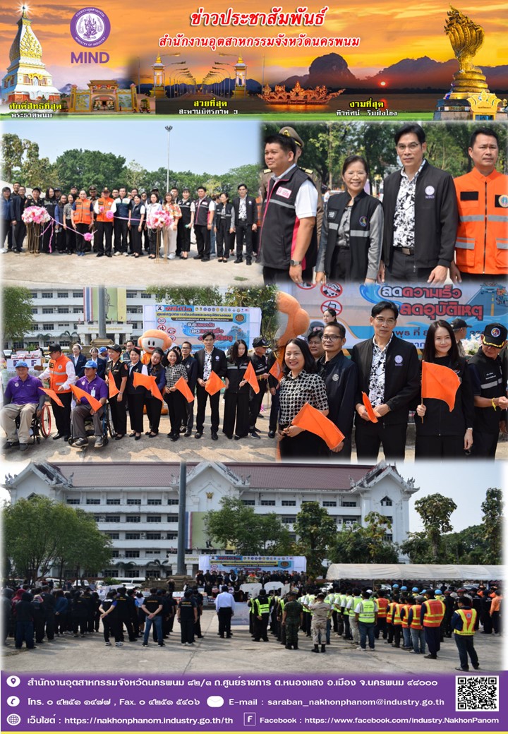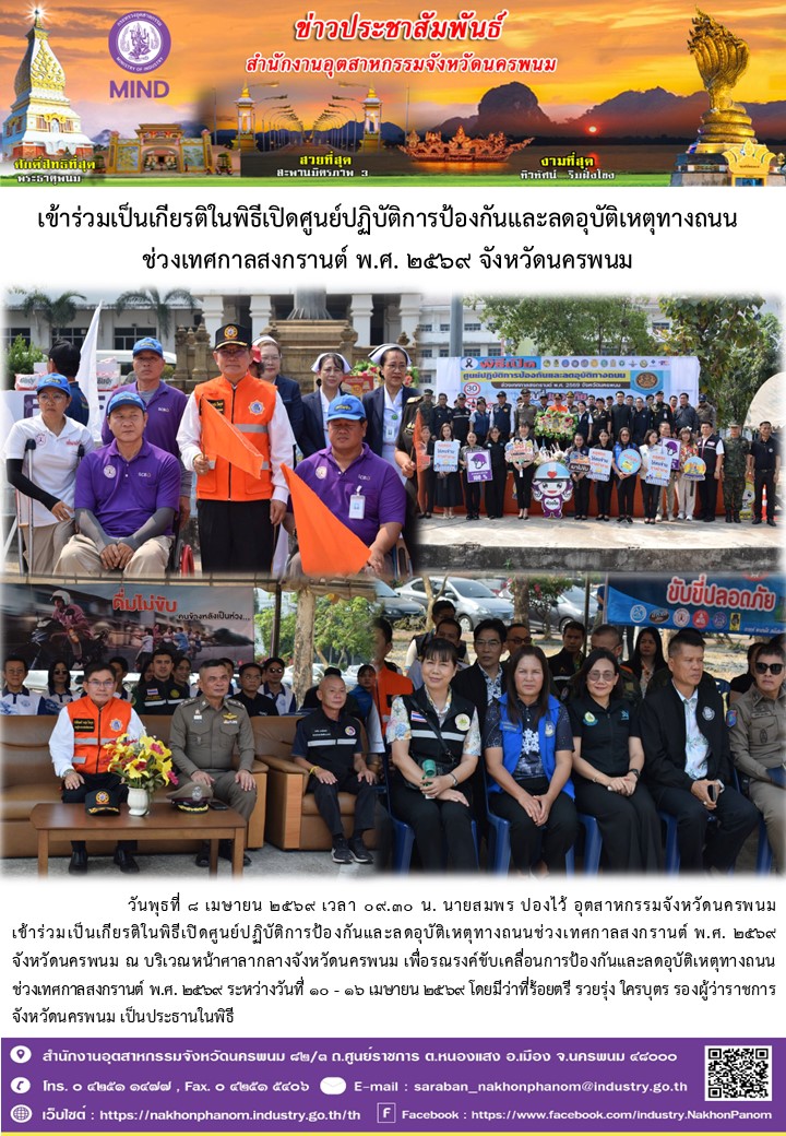 วันพุธที่ 8 เมษายน 2569 เวลา 09.30 น. นายสมพร ปองไว้ อุตสาหกรรมจังหวัดนครพนม เข้าร่วมเป็นเกียรติในพิธีเปิดศูนย์ปฏิบัติการป้องกันและลดอุบัติเหตุทางถนนช่วงเทศกาลสงกรานต์ พ.ศ. 2569 จังหวัดนครพนม ณ บริเวณหน้าศาลากลางจังหวัดนครพนม เพื่อรณรงค์ขับเคลื่อนการป้องกันและลดอุบัติเหตุทางถนนช่วงเทศกาลสงกรานต์ พ.ศ. 2569 ระหว่างวันที่ 10 - 16 เมษายน 2569 โดยมีว่าที่ร้อยตรี รวยรุ่ง ใครบุตร รองผู้ว่าราชการจังหวัดนครพนม เป็นประธานในพิธี