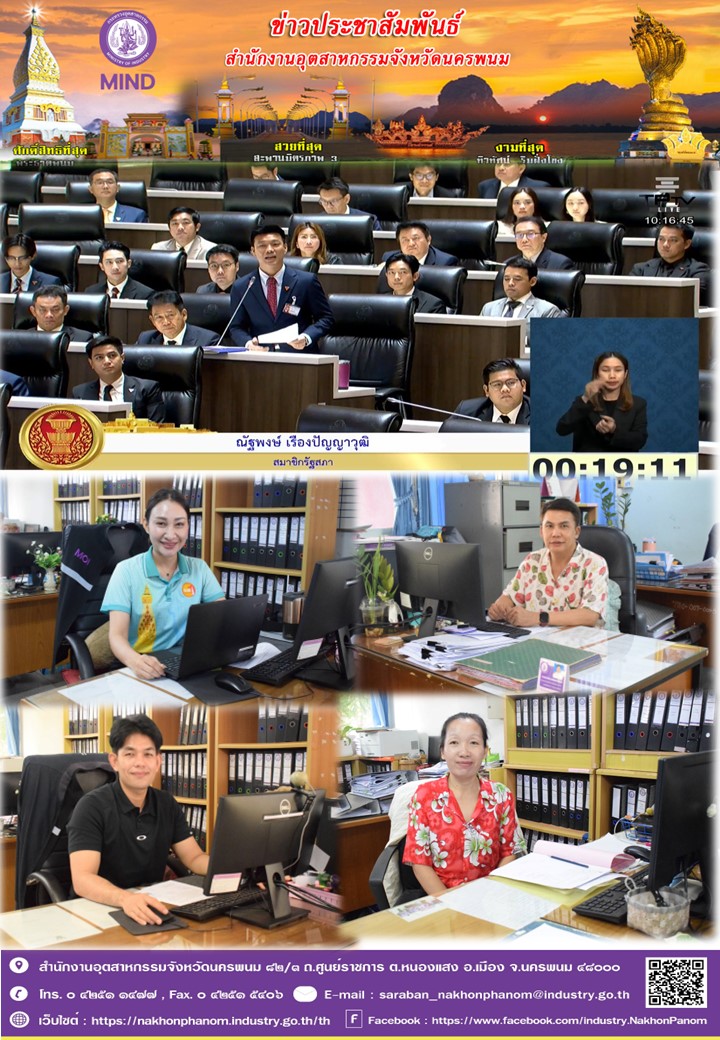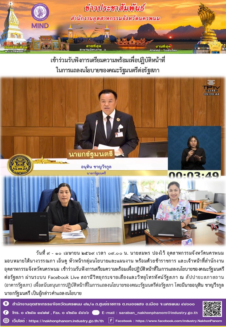 วันที่ 9 - 10 เมษายน 2569 เวลา 09.00 น. นายสมพร ปองไว้ อุตสาหกรรมจังหวัดนครพนม มอบหมายให้นางวรรณภา เอ็นดู หัวหน้ากลุ่มนโยบายและแผนงาน พร้อมด้วยข้าราชการ และเจ้าหน้าที่สำนักงานอุตสาหกรรมจังหวัดนครพนม เข้าร่วมรับฟังการเตรียมความพร้อมเพื่อปฏิบัติหน้าที่ในการแถลงนโยบายของคณะรัฐมนตรีต่อรัฐสภา ผ่านระบบ Facebook Live สถานีวิทยุกระจายเสียงและวิทยุโทรทัศน์รัฐสภา ณ สัปปายะสภาสถาน (อาคารรัฐสภา) เพื่อสนับสนุนการปฏิบัติหน้าที่ในการแถลงนโยบายของคณะรัฐมนตรีต่อรัฐสภา โดยมีนายอนุทิน ชาญวีรกูล นายกรัฐมนตรี เป็นผู้กล่าวคำแถลงนโยบาย