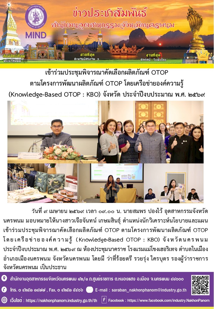 วันที่ 9 เมษายน 2569 เวลา 09.00 น. นายสมพร ปองไว้ อุตสาหกรรมจังหวัดนครพนม มอบหมายให้นางสาวเจือจันทน์ เกษมสินธุ์ ตำแหน่งนักวิเคราะห์นโยบายและแผน เข้าร่วมประชุมพิจารณาคัดเลือกผลิตภัณฑ์ OTOP ตามโครงการพัฒนาผลิตภัณฑ์ OTOP โดยเครือข่ายองค์ความรู้ (Knowledge-Based OTOP : KBO) จังหวัดนครพนม ประจำปีงบประมาณ พ.ศ. 2569 ณ ห้องประชุมนาคราช โรงแรมแม่โขงเฮอริเทจ ตำบลในเมืองอำเภอเมืองนครพนม จังหวัดนครพนม โดยมี ว่าที่ร้อยตรี รวยรุ่ง ใครบุตร รองผู้ว่าราชการจังหวัดนครพนม เป็นประธาน