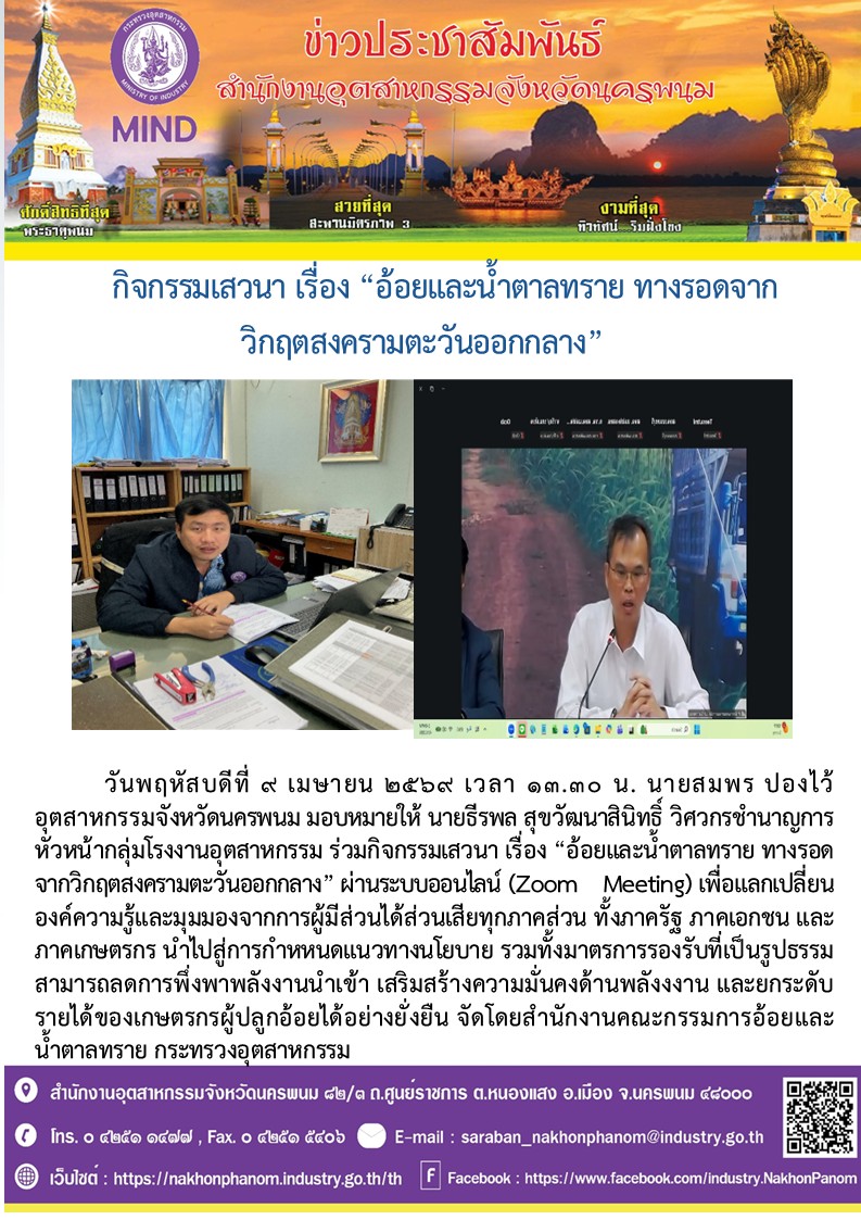 วันพฤหัสบดีที่ 9 เมษายน 2569 เวลา 13.30 น. นายสมพร ปองไว้ อุตสาหกรรมจังหวัดนครพนม มอบหมายให้ นายธีรพล สุขวัฒนาสินิทธิ์ วิศวกรชำนาญการ หัวหน้ากลุ่มโรงงานอุตสาหกรรม ร่วมกิจกรรมเสวนา เรื่อง “อ้อยและน้ำตาลทราย ทางรอดจากวิกฤตสงครามตะวันออกกลาง” ผ่านระบบออนไลน์ (Zoom Meeting) เพื่อแลกเปลี่ยนองค์ความรู้และมุมมองจากการผู้มีส่วนได้ส่วนเสียทุกภาคส่วน ทั้งภาครัฐ ภาคเอกชน และภาคเกษตรกร นำไปสู่การกำหหนดแนวทางนโยบาย รวมทั้งมาตรการรองรับที่เป็นรูปธรรม สามารถลดการพึ่งพาพลังงานนำเข้า เสริมสร้างความมั่นคงด้านพลังงงาน และยกระดับรายได้ของเกษตรกรผู้ปลูกอ้อยได้อย่างยั่งยืน จัดโดยสำนักงานคณะกรรมการอ้อยและน้ำตาลทราย กระทรวงอุตสาหกรรม
