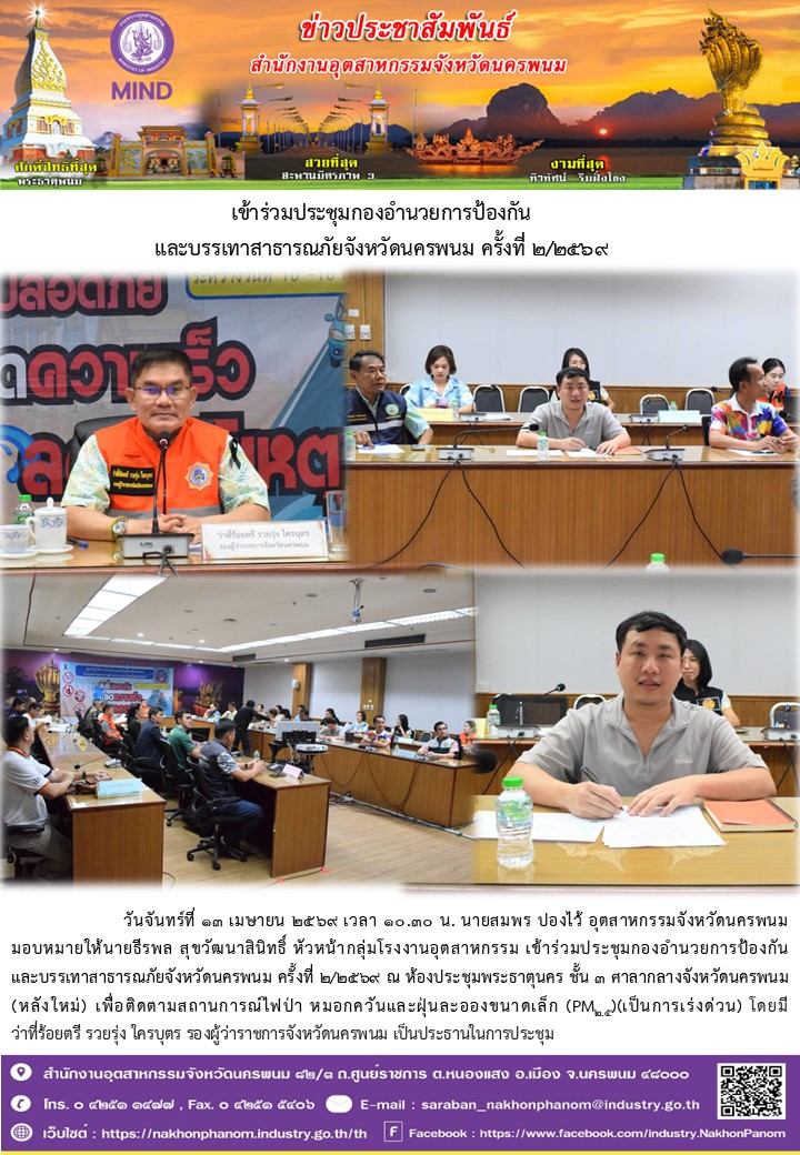 วันจันทร์ที่ 13 เมษายน 2569 เวลา 10.30 น. นายสมพร ปองไว้ อุตสาหกรรมจังหวัดนครพนม มอบหมายให้นายธีรพล สุขวัฒนาสินิทธิ์ หัวหน้ากลุ่มโรงงานอุตสาหกรรม เข้าร่วมประชุมกองอำนวยการป้องกันและบรรเทาสาธารณภัยจังหวัดนครพนม ครั้งที่ 2/2569 ณ ห้องประชุมพระธาตุนคร ชั้น 3 ศาลากลางจังหวัดนครพนม (หลังใหม่) เพื่อติดตามสถานการณ์ไฟป่า หมอกควันและฝุ่นละอองขนาดเล็ก (PM2.5)(เป็นการเร่งด่วน) โดยมีว่าที่ร้อยตรี รวยรุ่ง ใครบุตร รองผู้ว่าราชการจังหวัดนครพนม เป็นประธานในการประชุม