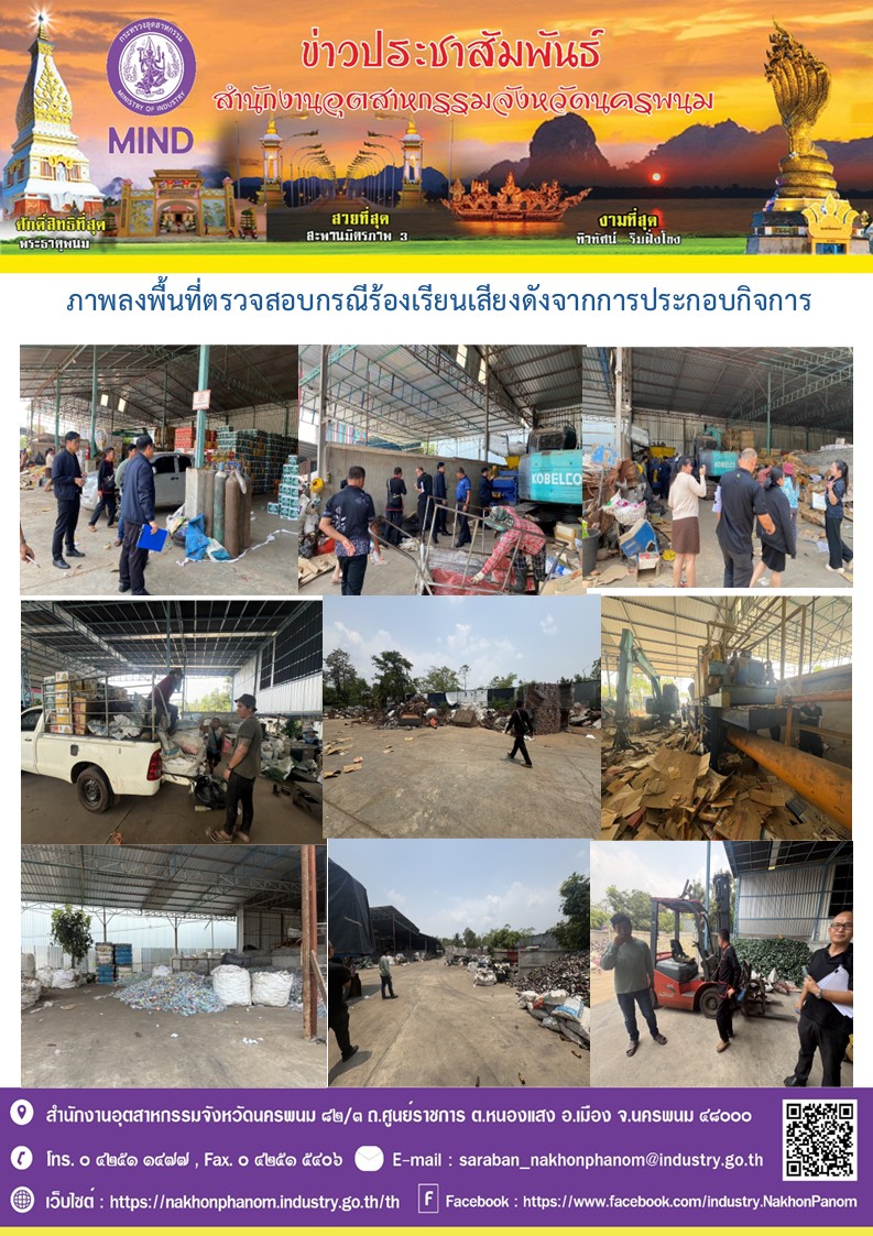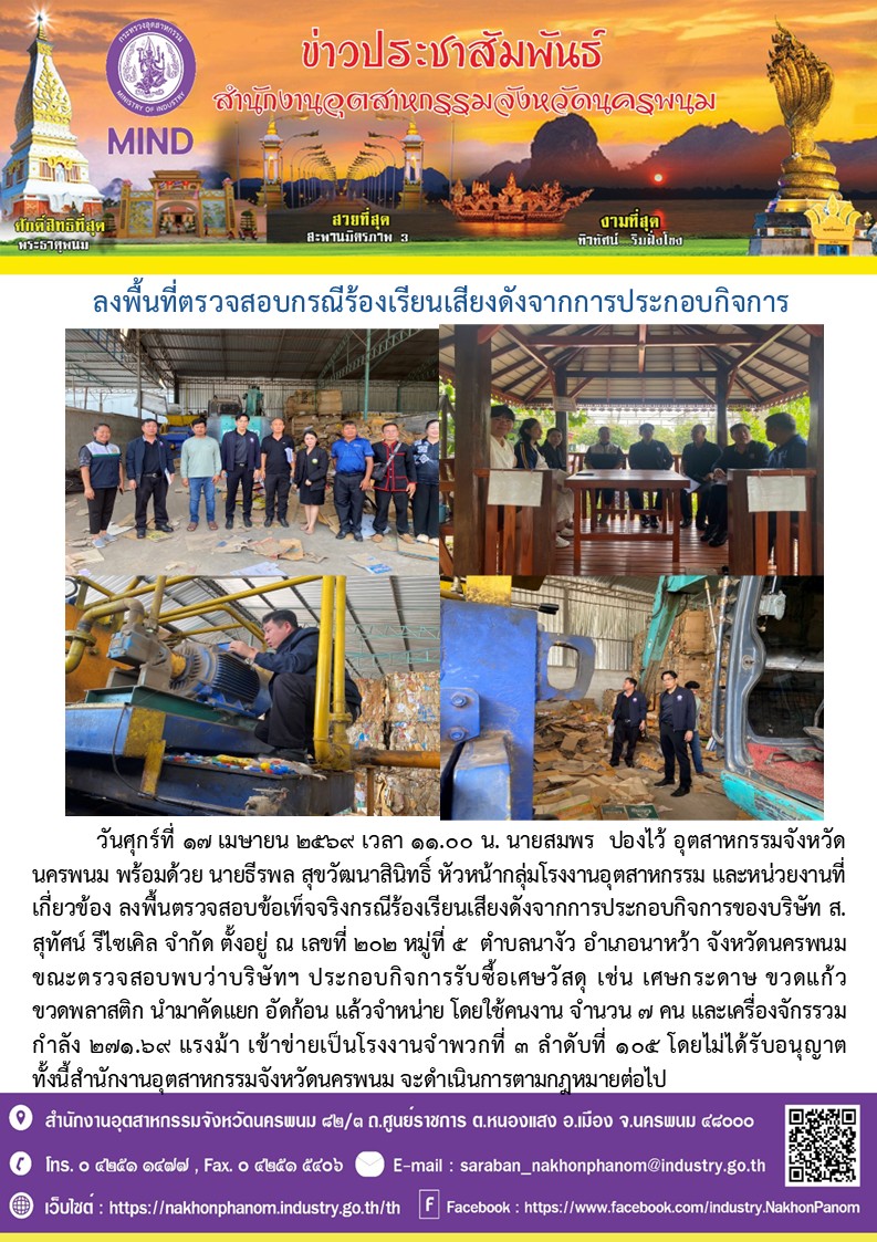 วันศุกร์ที่ 17 เมษายน 2569 เวลา 11.00 น. นายสมพร ปองไว้ อุตสาหกรรมจังหวัดนครพนม พร้อมด้วย นายธีรพล สุขวัฒนาสินิทธิ์ หัวหน้ากลุ่มโรงงานอุตสาหกรรม และหน่วยงานที่เกี่ยวข้อง ลงพื้นตรวจสอบข้อเท็จจริงกรณีร้องเรียนเสียงดังจากการประกอบกิจการของบริษัท ส.สุทัศน์ รีไซเคิล จำกัด ตั้งอยู่ ณ เลขที่ 202 หมู่ที่ 5 ตำบลนางัว อำเภอนาหว้า จังหวัดนครพนม ขณะตรวจสอบพบว่าบริษัทฯ ประกอบกิจการรับซื้อเศษวัสดุ เช่น เศษกระดาษ ขวดแก้ว ขวดพลาสติก นำมาคัดแยก อัดก้อน แล้วจำหน่าย โดยใช้คนงาน จำนวน 7 คน และเครื่องจักรรวม กำลัง 271.69 แรงม้า เข้าข่ายเป็นโรงงานจำพวกที่ 3 ลำดับที่ 105 โดยไม่ได้รับอนุญาต ทั้งนี้สำนักงานอุตสาหกรรมจังหวัดนครพนม จะดำเนินการตามกฎหมายต่อไป