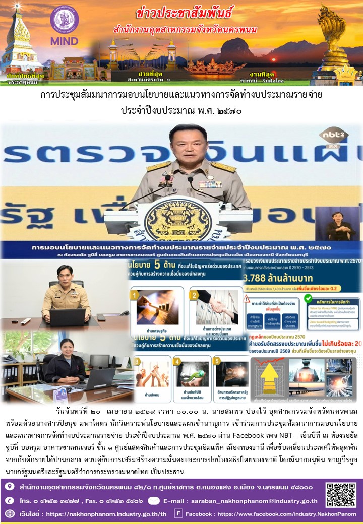 วันจันทร์ที่ 20 เมษายน 2569 เวลา 10.00 น. นายสมพร ปองไว้ อุตสาหกรรมจังหวัดนครพนม พร้อมด้วยนางสาวปิยนุช มหาโคตร นักวิเคราะห์นโยบายและแผนชำนาญการ เข้าร่วมการประชุมสัมมนาการมอบนโยบายและแนวทางการจัดทำงบประมาณรายจ่าย ประจำปีงบประมาณ พ.ศ. 2570 ผ่าน Facebook เพจ NBT – เอ็นบีที ณ ห้องรอยัล จูบิลี่ บอลรูม อาคารชาเลนเจอร์ ชั้น 1 ศูนย์แสดงสินค้าและการประชุมอิมแพ็ค เมืองทองธานี เพื่อขับเคลื่อนประเทศให้หลุดพ้นจากกับดักรายได้ปานกลาง ควบคู่กับการเสริมสร้างความมั่นคงและการปกป้องอธิปไตยของชาติ โดยมีนายอนุทิน ชาญวีรกูล นายกรัฐมนตรีและรัฐมนตรีว่าการกระทรวงมหาดไทย เป็นประธาน