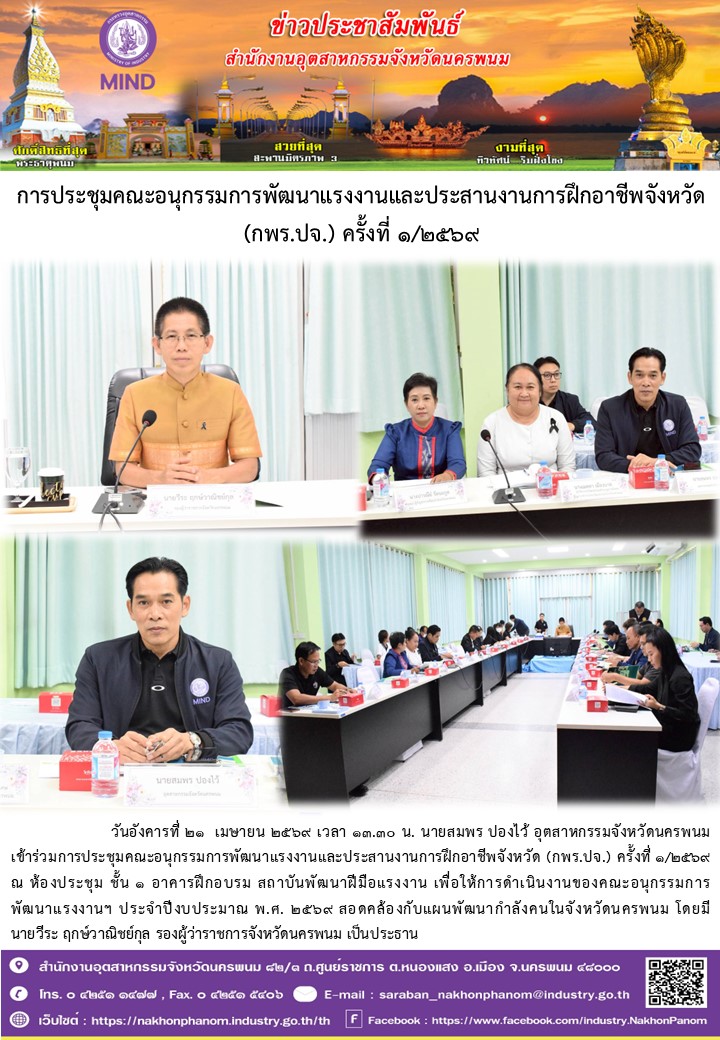 วันอังคารที่ 21 เมษายน 2569 เวลา 13.30 น. นายสมพร ปองไว้ อุตสาหกรรมจังหวัดนครพนม เข้าร่วมการประชุมคณะอนุกรรมการพัฒนาแรงงานและประสานงานการฝึกอาชีพจังหวัด (กพร.ปจ.) ครั้งที่ 1/2569 ณ ห้องประชุม ชั้น 1 อาคารฝึกอบรม สถาบันพัฒนาฝีมือแรงงาน เพื่อให้การดำเนินงานของคณะอนุกรรมการพัฒนาแรงงานฯ ประจำปีงบประมาณ พ.ศ. 2569 สอดคล้องกับแผนพัฒนากำลังคนในจังหวัดนครพนม โดยมีนายวีระ ฤกษ์วาณิชย์กุล รองผู้ว่าราชการจังหวัดนครพนม เป็นประธาน