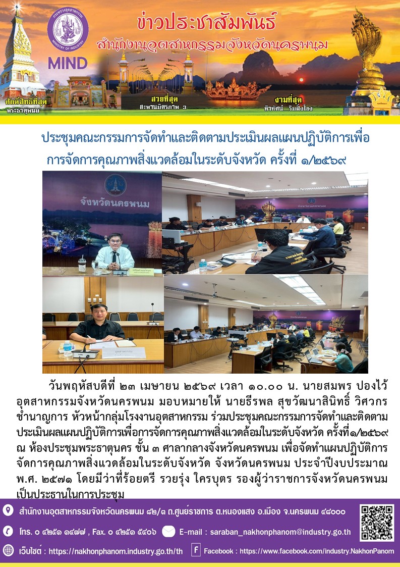 วันพฤหัสบดีที่ 23 เมษายน 2569 เวลา 10.00 น. นายสมพร ปองไว้ อุตสาหกรรมจังหวัดนครพนม มอบหมายให้ นายธีรพล สุขวัฒนาสินิทธิ์ วิศวกรชำนาญการ หัวหน้ากลุ่มโรงงานอุตสาหกรรม ร่วมประชุมคณะกรรมการจัดทำและติดตามประเมินผลแผนปฏิบัติการเพื่อการจัดการคุณภาพสิ่งแวดล้อมในระดับจังหวัด ครั้งที่1/2569 ณ ห้องประชุมพระธาตุนคร ชั้น 3 ศาลากลางจังหวัดนครพนม เพื่อจัดทำแผนปฏิบัติการจัดการคุณภาพสิ่งแวดล้อมในระดับจังหวัด จังหวัดนครพนม ประจำปีงบประมาณ พ.ศ. 2571 โดยมีว่าที่ร้อยตรี รวยรุ่ง ใครบุตร รองผู้ว่าราชการจังหวัดนครพนม เป็นประธานในการประชุม