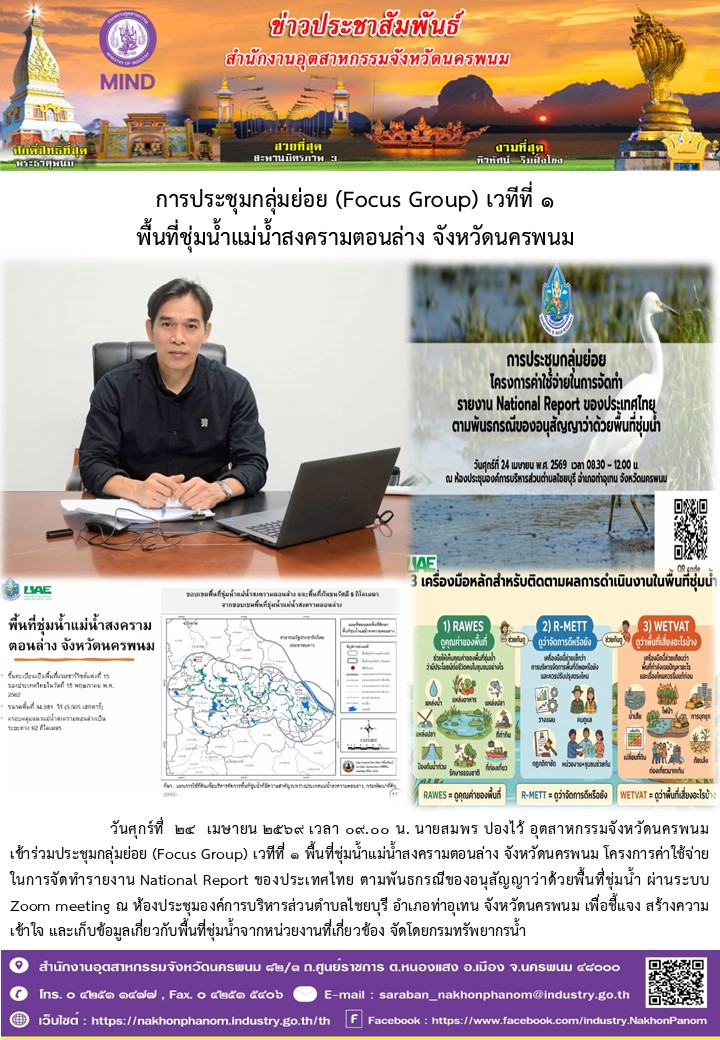 วันศุกร์ที่ 24 เมษายน 2569 เวลา 09.00 น. นายสมพร ปองไว้ อุตสาหกรรมจังหวัดนครพนม เข้าร่วมประชุมกลุ่มย่อย (Focus Group) เวทีที่ 1 พื้นที่ชุ่มน้ำแม่น้ำสงครามตอนล่าง จังหวัดนครพนม โครงการค่าใช้จ่ายในการจัดทำรายงาน National Report ของประเทศไทย ตามพันธกรณีของอนุสัญญาว่าด้วยพื้นที่ชุ่มน้ำ ผ่านระบบ Zoom meeting ณ ห้องประชุมองค์การบริหารส่วนตำบลไชยบุรี อำเภอท่าอุเทน จังหวัดนครพนม เพื่อชี้แจง สร้างความเข้าใจ และเก็บข้อมูลเกี่ยวกับพื้นที่ชุ่มน้ำจากหน่วยงานที่เกี่ยวข้อง จัดโดยกรมทรัพยากรน้ำ