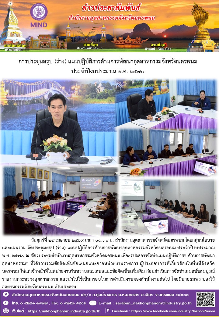 จัดประชุมสรุป (ร่าง) แผนปฏิบัติการด้านการพัฒนาอุตสาหกรรมจังหวัดนครพนม ประจำปีงบประมาณ พ.ศ. 2570