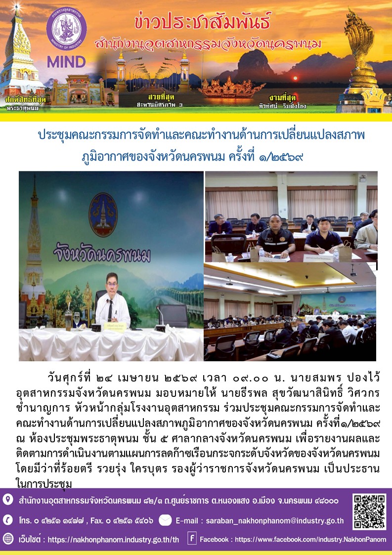วันศุกร์ที่ 24 เมษายน 2569 เวลา 09.00 น. นายสมพร ปองไว้ อุตสาหกรรมจังหวัดนครพนม มอบหมายให้ นายธีรพล สุขวัฒนาสินิทธิ์ วิศวกรชำนาญการ หัวหน้ากลุ่มโรงงานอุตสาหกรรม ร่วมประชุมคณะกรรมการจัดทำและคณะทำงานด้านการเปลี่ยนแปลงสภาพภูมิอากาศของจังหวัดนครพนม ครั้งที่1/2569 ณ ห้องประชุมพระธาตุพนม ชั้น 5 ศาลากลางจังหวัดนครพนม เพื่อรายงานผลและติดตามการดำเนินงานตามแผนการลดก๊าซเรือนกระจกระดับจังหวัดของจังหวัดนครพนม โดยมีว่าที่ร้อยตรี รวยรุ่ง ใครบุตร รองผู้ว่าราชการจังหวัดนครพนม เป็นประธาน ในการประชุม