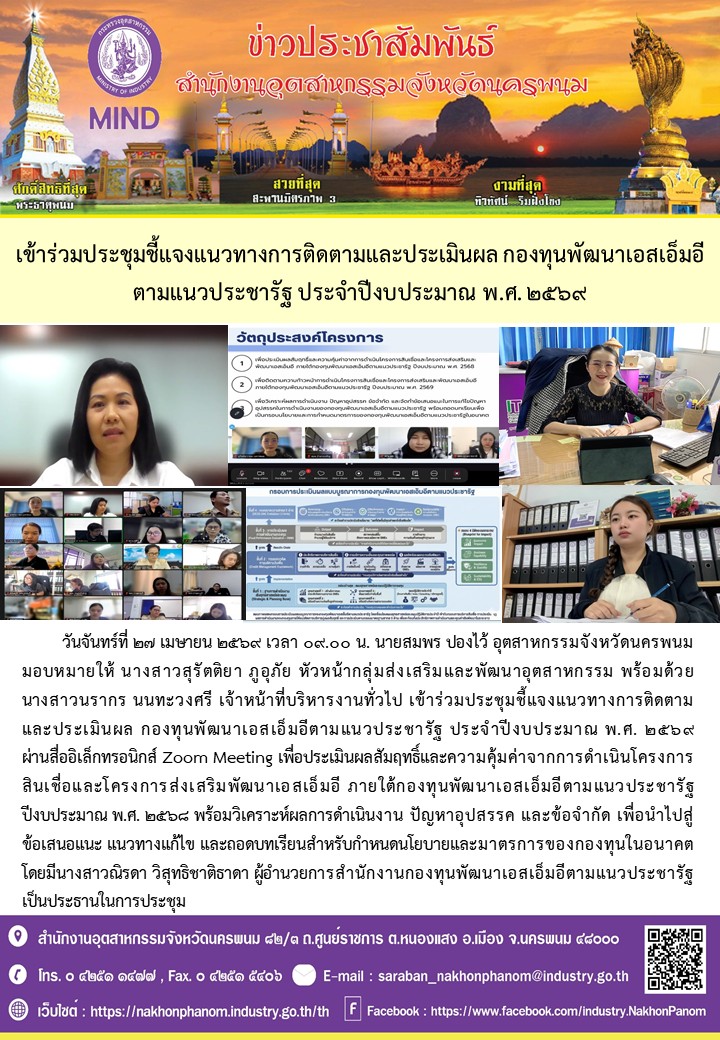 วันจันทร์ที่ 27 เมษายน 2569 เวลา 09.00 น. นายสมพร ปองไว้ อุตสาหกรรมจังหวัดนครพนม มอบหมายให้ นางสาวสุรัตติยา ภูอุภัย หัวหน้ากลุ่มส่งเสริมและพัฒนาอุตสาหกรรม พร้อมด้วย นางสาวนรากร นนทะวงศรี เจ้าหน้าที่บริหารงานทั่วไป เข้าร่วมประชุมชี้แจงแนวทางการติดตามและประเมินผลกองทุนพัฒนาเอสเอ็มอีตามแนวประชารัฐ ประจำปีงบประมาณ พ.ศ. 2569 ผ่านสื่ออิเล็กทรอนิกส์ Zoom Meeting เพื่อประเมินผลสัมฤทธิ์และความคุ้มค่าจากการดำเนินโครงการสินเชื่อและโครงการส่งเสริมพัฒนาเอสเอ็มอี ภายใต้กองทุนพัฒนาเอสเอ็มอีตามแนวประชารัฐ ปีงบประมาณ พ.ศ.2568 พร้อมวิเคราะห์ผลการดำเนินงาน ปัญหาอุปสรรค และข้อจำกัด เพื่อนำไปสู่ข้อเสนอแนะ แนวทางแก้ไข และถอดบทเรียน สำหรับกำหนดนโยบายและมาตรการของกองทุนในอนาคต โดยมีนางสาวณิรดา วิสุทธิชาติธาดา ผู้อำนวยการสำนักงานกองทุนพัฒนาเอสเอ็มอีตามแนวประชารัฐ เป็นประธานในการประชุม
