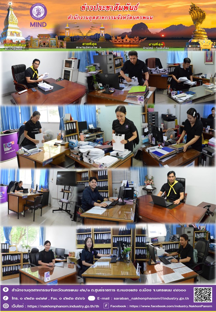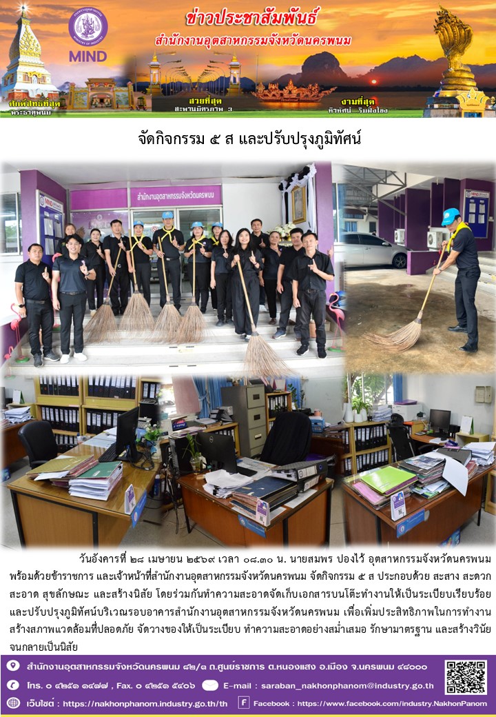 วันอังคารที่ 28 เมษายน 2569 เวลา 08.30 น. นายสมพร ปองไว้ อุตสาหกรรมจังหวัดนครพนม พร้อมด้วยข้าราชการ และเจ้าหน้าที่สำนักงานอุตสาหกรรมจังหวัดนครพนม จัดกิจกรรม 5 ส ประกอบด้วย สะสาง สะดวก สะอาด สุขลักษณะ และสร้างนิสัย โดยร่วมกันทำความสะอาดจัดเก็บเอกสารบนโต๊ะทำงานให้เป็นระเบียบเรียบร้อยและปรับปรุงภูมิทัศน์บริเวณรอบอาคารสำนักงานอุตสาหกรรมจังหวัดนครพนม เพื่อเพิ่มประสิทธิภาพในการทำงาน สร้างสภาพแวดล้อมที่ปลอดภัย จัดวางของให้เป็นระเบียบ ทำความสะอาดอย่างสม่ำเสมอ รักษามาตรฐาน และสร้างวินัยจนกลายเป็นนิสัย