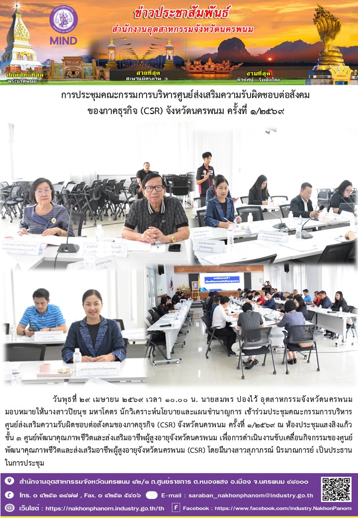 วันพุธที่ 29 เมษายน 2569 เวลา 10.00 น. นายสมพร ปองไว้ อุตสาหกรรมจังหวัดนครพนม มอบหมายให้นางสาวปิยนุช มหาโคตร นักวิเคราะห์นโยบายและแผนชำนาญการ เข้าร่วมประชุมคณะกรรมการบริหารศูนย์ส่งเสริมความรับผิดชอบต่อสังคมของภาคธุรกิจ (CSR) จังหวัดนครพนม ครั้งที่ 1/2569 ณ ห้องประชุมแสงสิงแก้ว ชั้น 3 ศูนย์พัฒนาคุณภาพชีวิตและส่งเสริมอาชีพผู้สูงอายุจังหวัดนครพนม เพื่อการดำเนินงานขับเคลื่อนกิจกรรมของศูนย์พัฒนาคุณภาพชีวิตและส่งเสริมอาชีพผู้สูงอายุจังหวัดนครพนม (CSR) โดยมีนางสาวสุภาภรณ์ นิรมาณการย์ รองประธานคณะกรรมการคนที่ 2 เป็นประธานในการประชุม