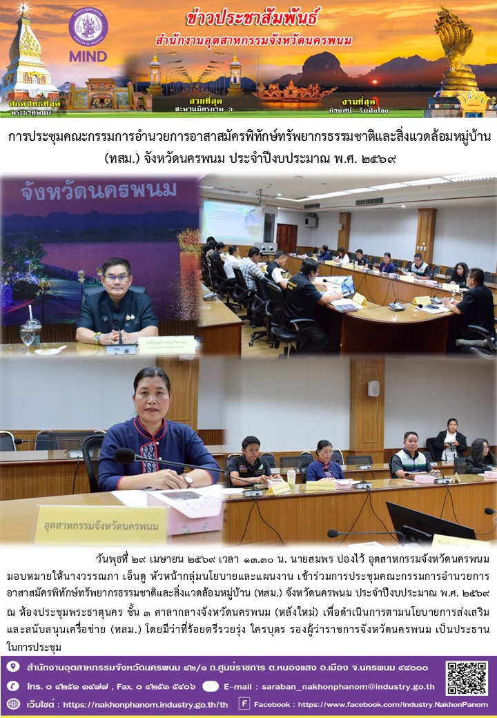 วันพุธที่ 29 เมษายน 2569 เวลา 13.30 น. นายสมพร ปองไว้ อุตสาหกรรมจังหวัดนครพนม มอบหมายให้นางวรรณภา เอ็นดู หัวหน้ากลุ่มนโยบายและแผนงาน เข้าร่วมการประชุมคณะกรรมการอำนวยการอาสาสมัครพิทักษ์ทรัพยากรธรรมชาติและสิ่งแวดล้อมหมู่บ้าน (ทสม.) จังหวัดนครพนม ประจำปีงบประมาณ พ.ศ. 2569 ณ ห้องประชุมพระธาตุนคร ชั้น 3 ศาลากลางจังหวัดนครพนม (หลังใหม่) เพื่อดำเนินการตามนโยบายการส่งเสริมและสนับสนุนเครื่อข่าย (ทสม.) โดยมีว่าที่ร้อยตรีรวยรุ่ง ใครบุตร รองผู้ว่าราชการจังหวัดนครพนม เป็นประธานในการประชุม